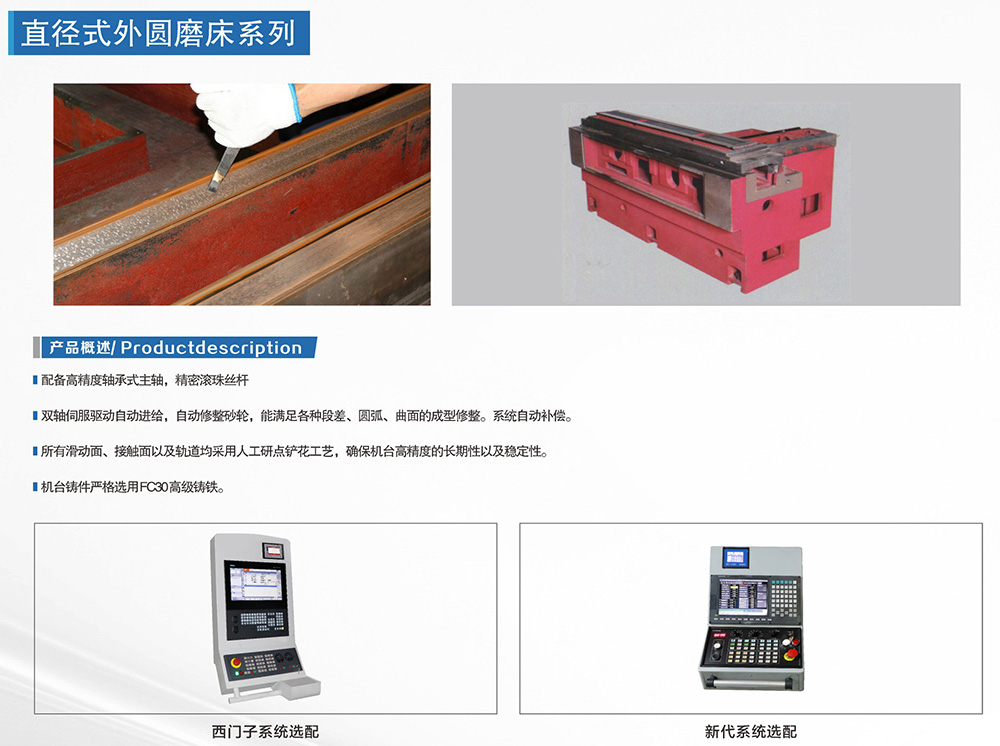 配備高精度軸承式主軸,精密滾珠絲桿 雙軸伺服驅動自動進給,自動修整砂輪,能滿足各種段差、圓弧、曲面的成型修整。系統自動補償。 所有滑動面、接觸面以及軌道均采用人工研點鏟花工藝,確保機臺高精度的長期性 以及穩定性機臺鑄件嚴格選用FC30高級鑄鐵。